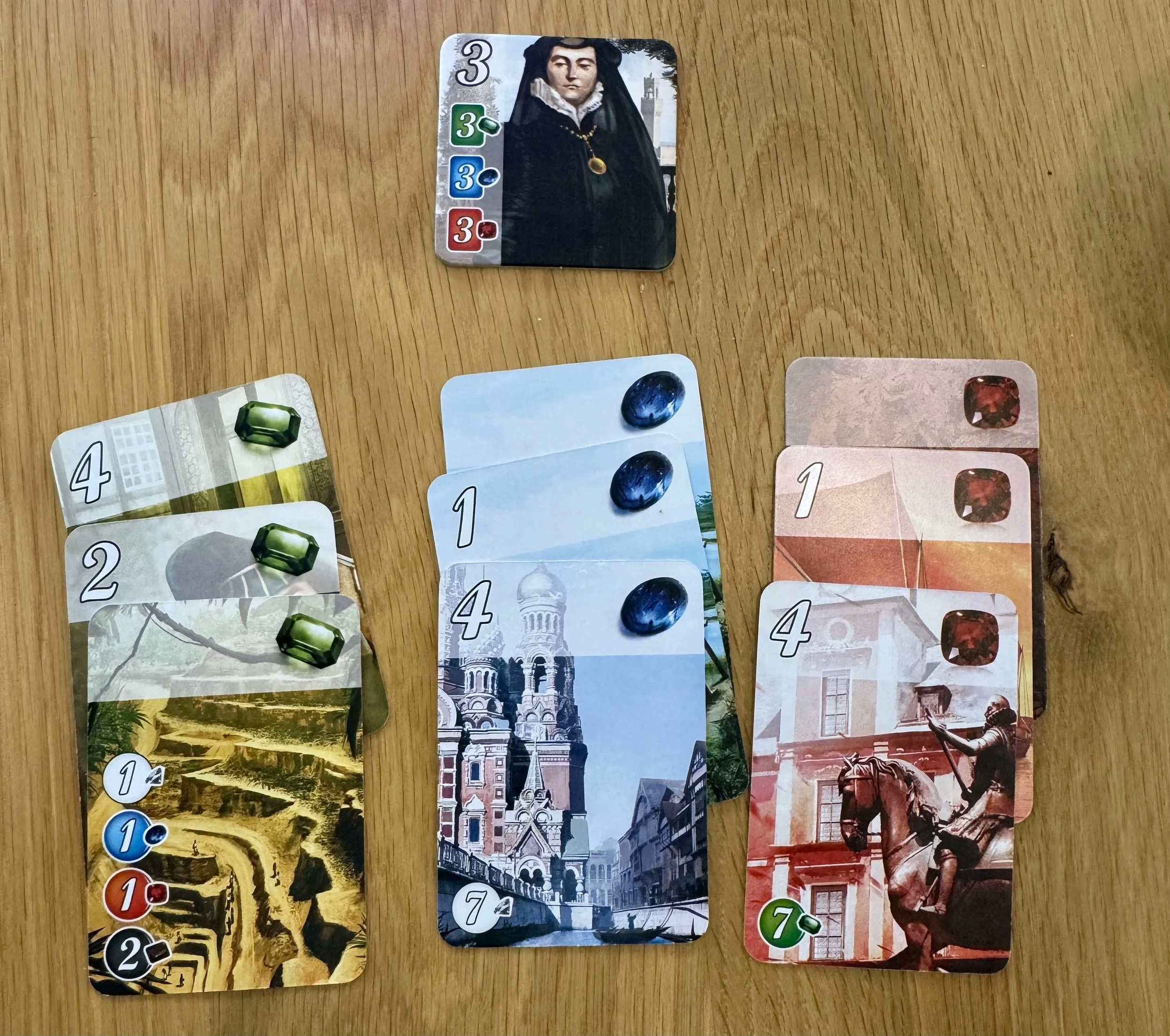 You get to claim the nobles on the board when you have the required number of gem cards of each color—usually 3 or 4 per color. the photo shows a late game setup that would earn you a visit from this particular noble.