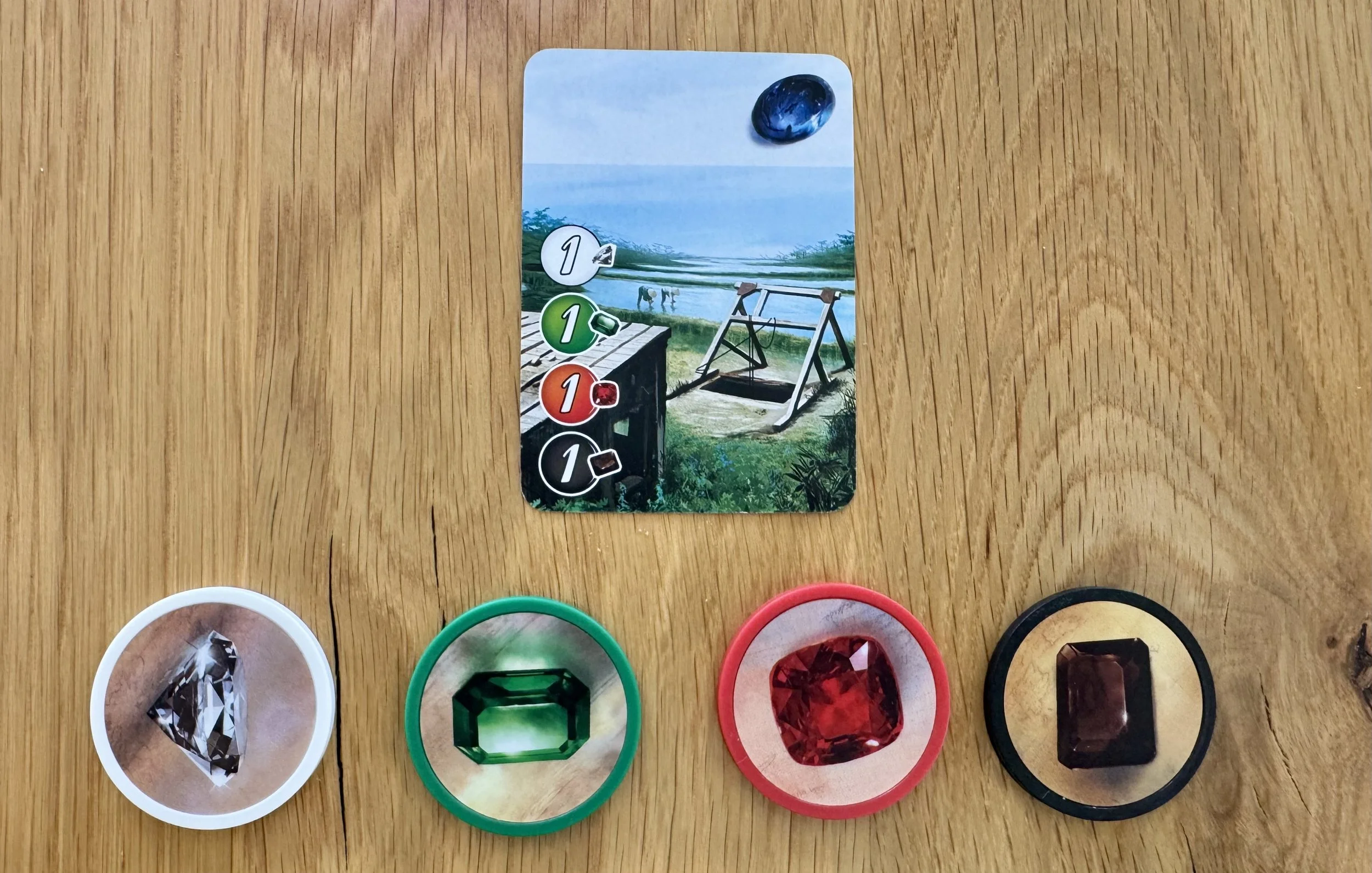 To buy this blue gem card, you need 1 each of white, green, red, and brown gem tokens…
